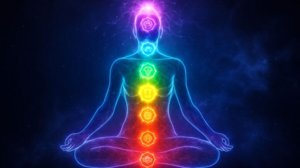 主に背骨に沿って第1~第7チャクラと呼ばれる7つの主要なポイントがあり、心身のエネルギーバランスを司り、活性化することで心身の調和や潜在能力の向上に繋がるとされています。
