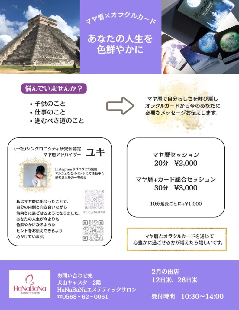 愛知県犬山市にある「HaNaBaNaエステティックサロン」で月2回、マヤ暦セッションをおこなっています。